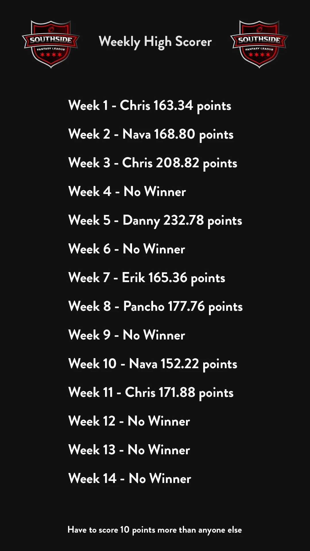 Speaking of which, this is fun and maybe we add more payouts next year?? Maybe we give some to the little guy? Lowest score of the week gets $5? NOT BIASED AT ALL