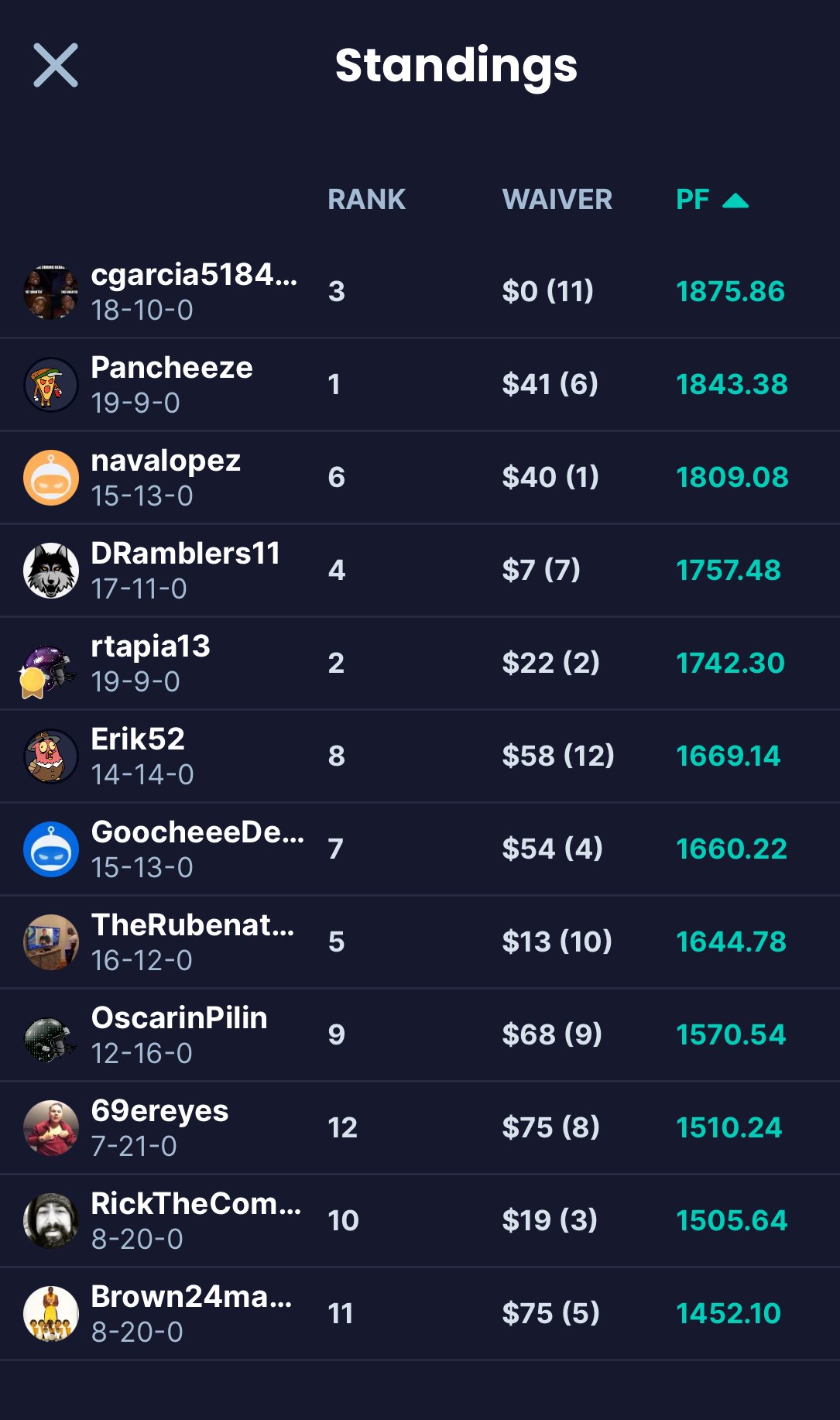 There’s still a lot of fun to be had this year, playoffs, consolation punishment (which is still TBD) and 1st overall pick. That being said, where does the league stand? I’m biased, but